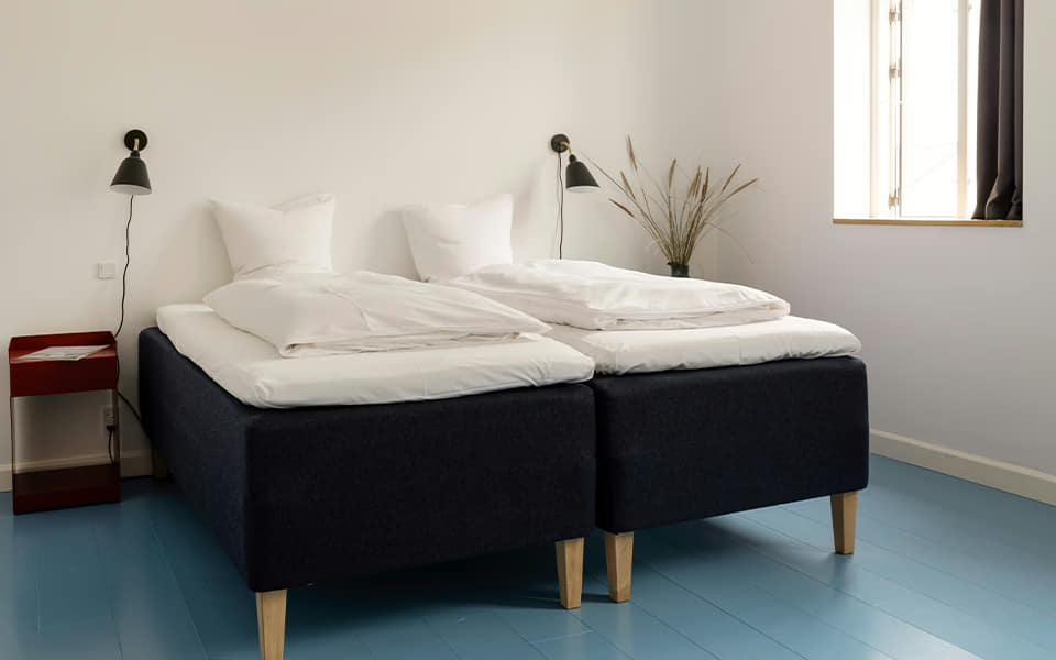 Rummeligt og handicapvenligt dobbeltværelse i stueplan med egen terrasse og nem adgang uden trin. Værelset har to enkeltsenge, som kan samles eller adskilles efter ønske. Indrettet med fokus på komfort og tilgængelighed i rolige omgivelser.